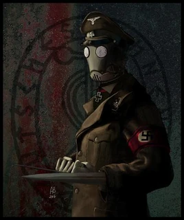 Wears his trademark, virtually indestructible, tight-fitting gas mask with a trench coat over his SS unoform.